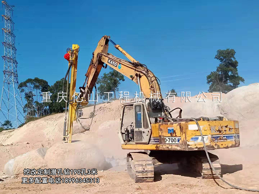 億山挖改潛孔鉆機(jī)各系列產(chǎn)品,廣泛適用于花崗巖、石灰石、大理石、火山石、青石、玄武巖、頁巖、砂巖、風(fēng)化巖、泥巖等所有巖石的各種爆破前鉆孔作業(yè);借助挖機(jī)的操作靈活性也可用于錨桿鉆孔以及孔徑較大的光伏孔;使用效率高于傳統(tǒng)的分體式潛孔鉆機(jī)。具操作簡易,設(shè)計人性化,感觀直接,實(shí)現(xiàn)挖掘機(jī)一機(jī)多用等特性。