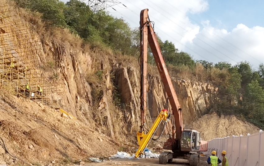 3、作業半徑擴大化 。因為挖掘機小臂不拆,它的作業半徑可以延長作業半徑2-3米,且仰角打孔、水平打孔、豎直打孔都可以實現。