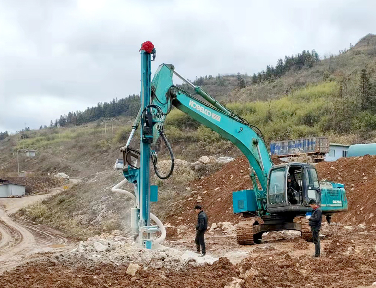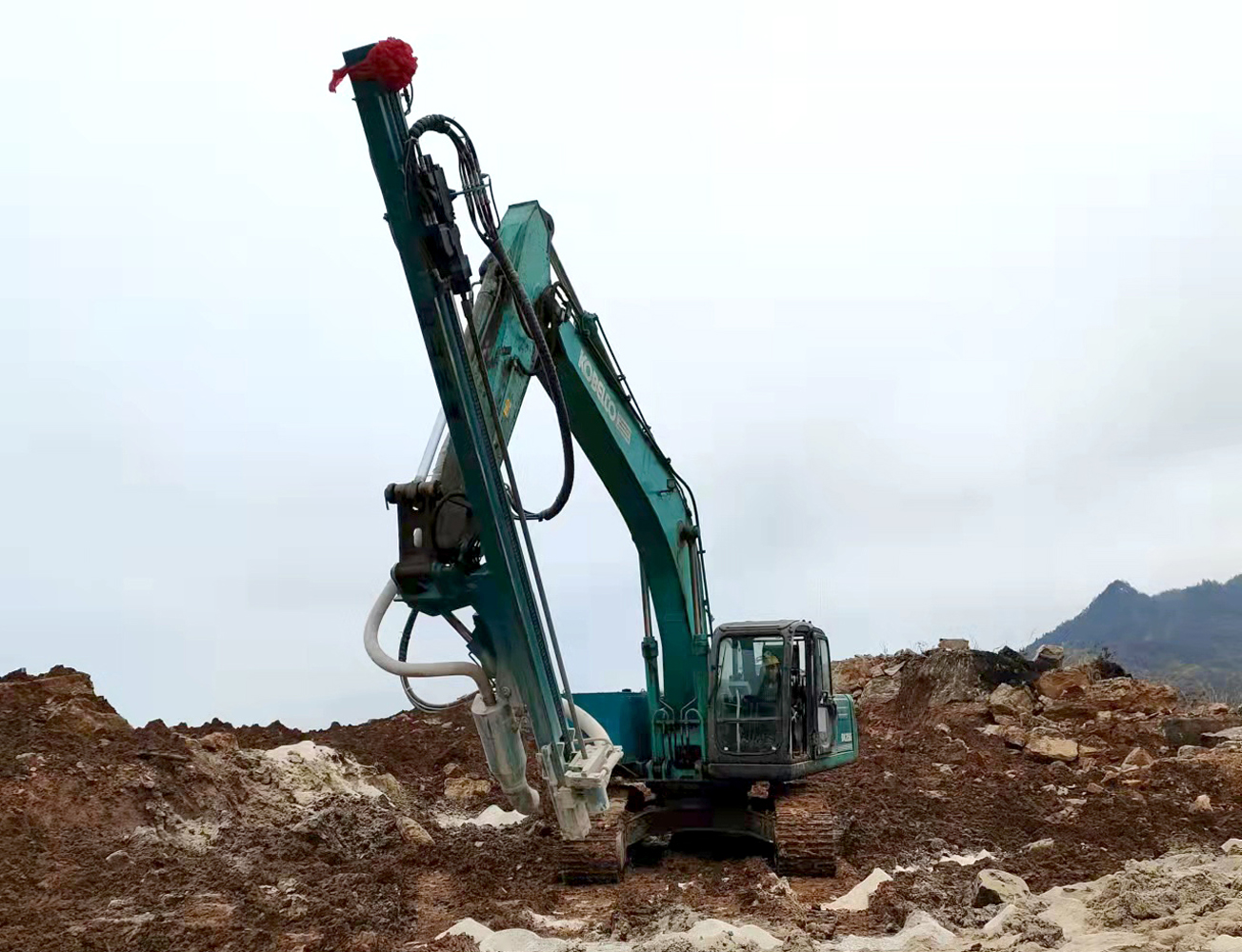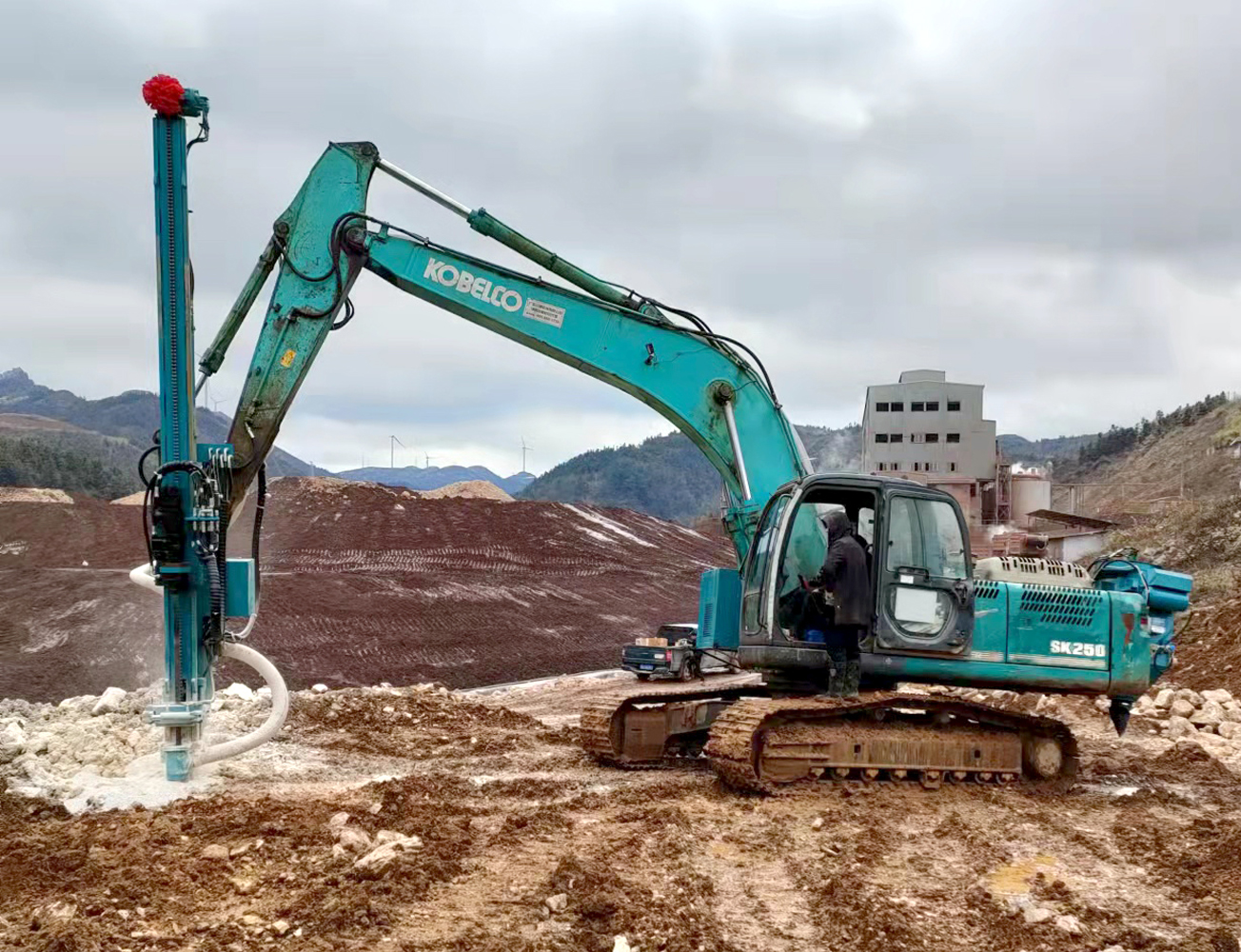 貴州凱里--神鋼挖掘機改裝鑿巖機鉆機90孔4.3米加吸塵